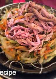 大刀 ザ ヒュージザンバー على تويتر カルニタス風のモホローストポーク 長時間かけて焼いたローストポークをほぐしてコギ版ヴィネグレットソースで和えて 生姜ニンニクパクチーご飯と一緒に サイドにはスモモのサラダを添えて こってりした肉にさっぱりとした